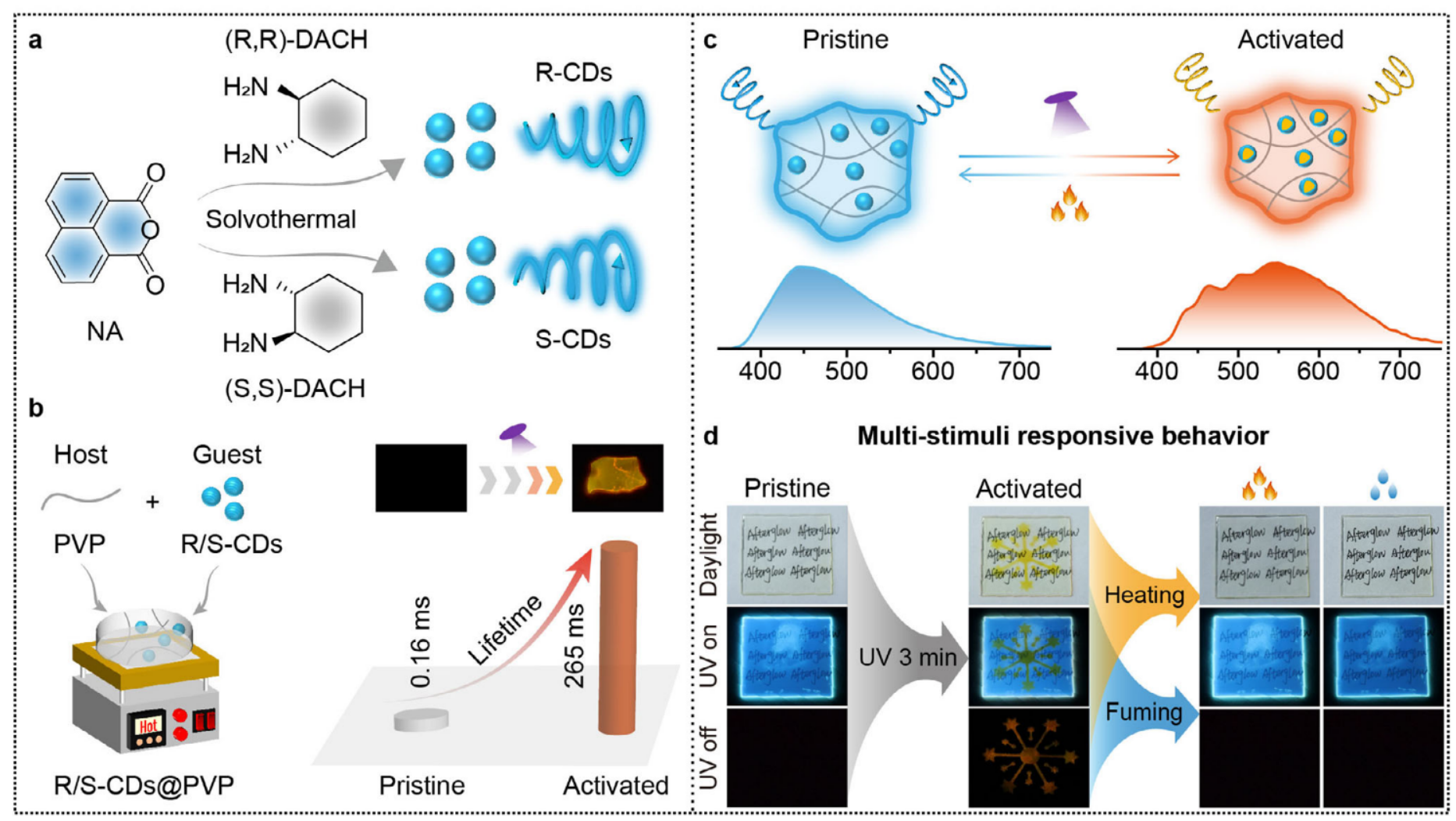 图1 手性光致变色和刺激发光R/S-CDs@PVP余辉材料的构建。