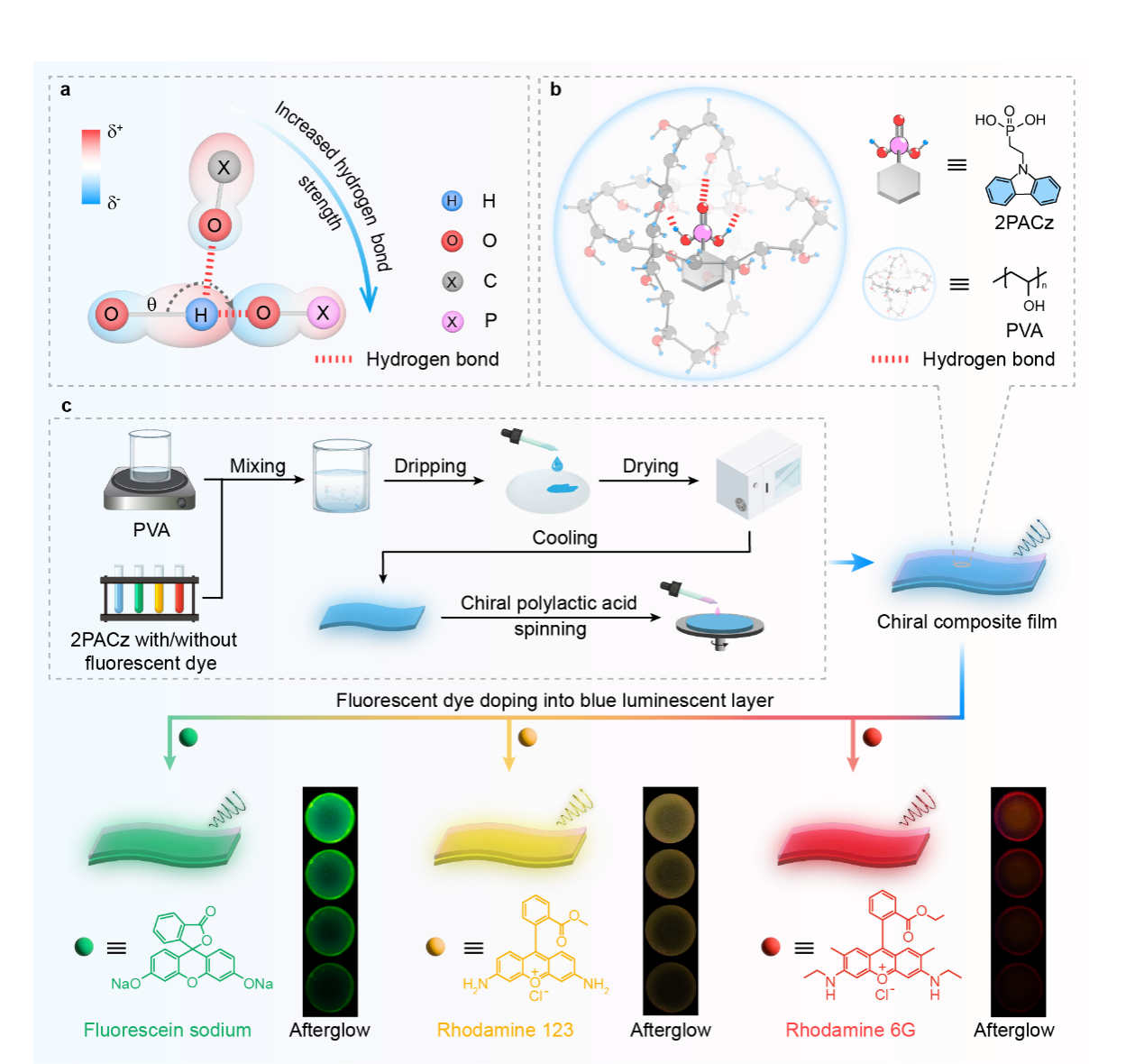 通过磷介导氢键和磷光能量转移构建多色手性有机余辉的示意图